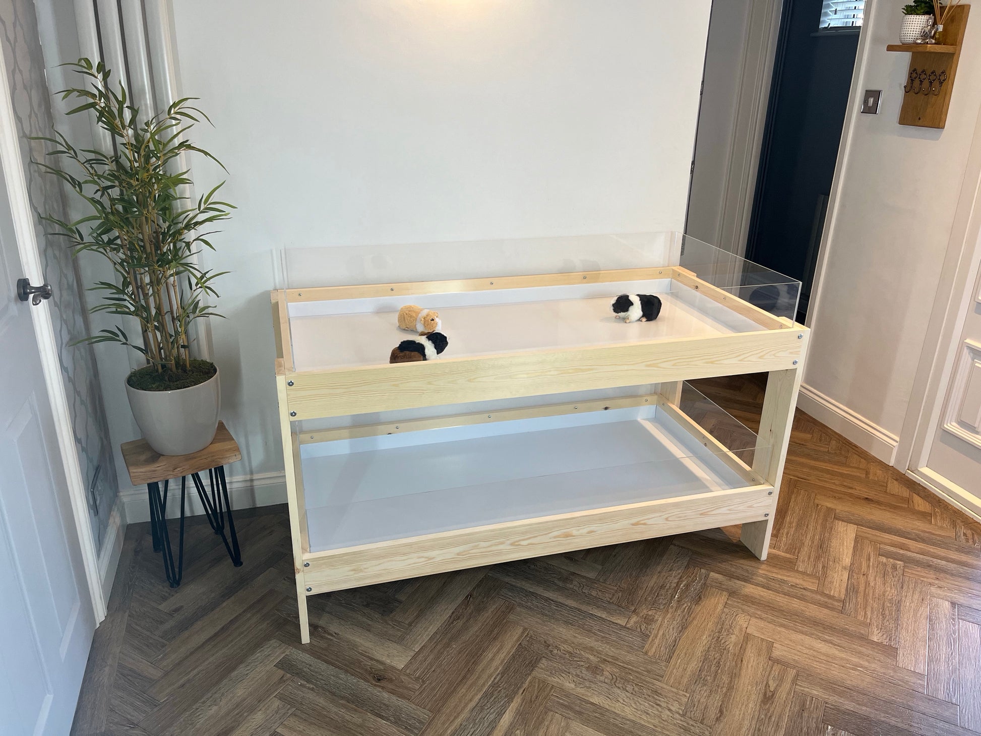 This luxury Guinea Pig enclosure comes with an open top design and Perspex walls to offer the best viewing and interaction possible. Finished in 20mm furniture grade pine wood (suitable for staining) and lined with a water proof plastic tray 55mm (2.2”) deep to retain bedding. This design prevents the chewing & urine staining of wood, preventing excess odours.
